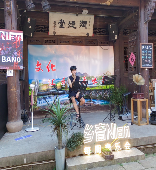 來到村中潤德堂,大家被一場別開生面的鄉(xiāng)村演唱會所吸引,歡快的旋律、質(zhì)樸的歌聲回蕩在村落,大家一邊欣賞著音樂,一邊乘涼,無比愜意。